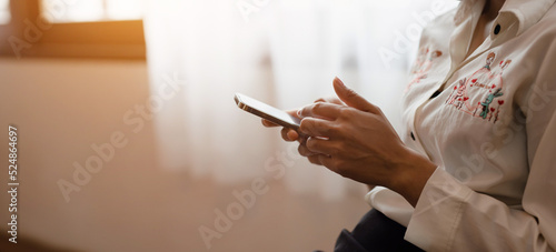 Close-up of a woman's hand using a mobile phone at home. Search ideas or social networks.
