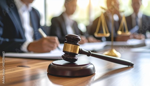 Close-up of a wooden judge's hammer resting on a court desk, with a writing lawyer in the blurry background