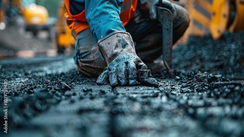 Close-up of a worker's gloved hand laying asphalt on a construction site. Detailed view, focus on the hand, showcasing the texture and work involved.