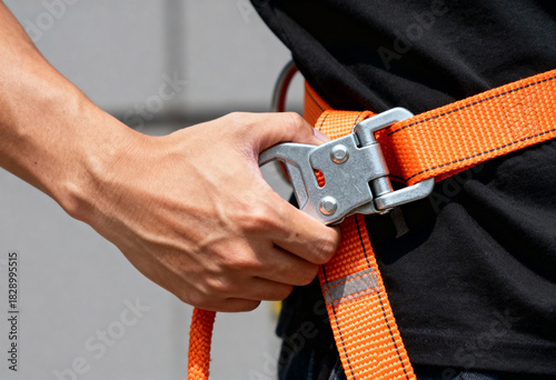 Close-up of a worker's hand adjusting an orange safety harness. Man fastening a metal buckle on fall protection equipment. Workplace safety and personal protective equipment (PPE) concept