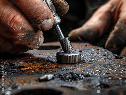 Close-up of a worker's hands screwing a bolt into a dirty, greasy surface in an industrial setting, showcasing precision and craftsmanship.