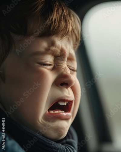 Close-up of a young boy crying with a distressed expression, emotional moment captured indoors, highlighting childhood emotions and feelings.