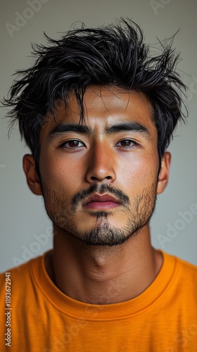 portrait, man, serious, intense, closeup, young, male, orange, shirt, hair, fashion, style, eye, facial hair, neutral, background, expression, sharpened, face, confident, photogenic, modern, casual attire, gaze, appearance, charisma, depth, texture, tone, vibrant, personality, minimalist, ethnicity, aesthetic, trendy, youth, detail, mood, attitude, relaxed