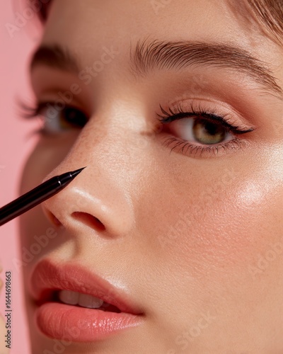 Closeup of a young woman using gel eyeliner smooth radiant skin natural beauty look soft lighting isolated on a pastel background premium cosmetic photography