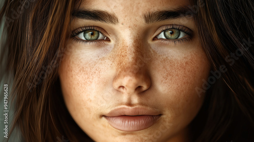 Close-up of a young woman with light green eyes, freckles, and medium brown hair. The focus is on her face, highlighting her natural skin texture and features.