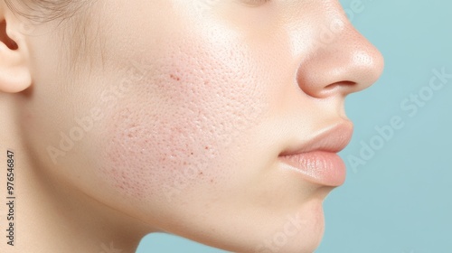Close-up of Acne Scars on a Person's Face - A photograph showcasing the texture of acne scars on a woman's face. The image highlights the uneven skin surface, redness, and potential for skin care.