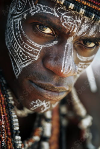 Close-up of African man with traditional face paint and necklace, powerful expression, blurred village background, East Africa.