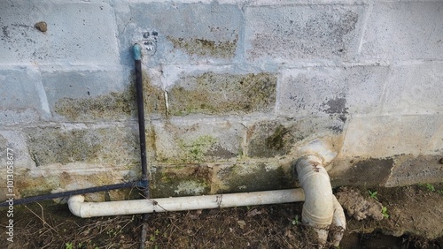 Close-up of aged concrete blocks showing signs of moss, stains, and weathering on a rough surface