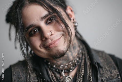 Close-up of alternative musician showcasing unique style with dreadlocks, dark makeup, tattoos, and piercings, representing underground music culture