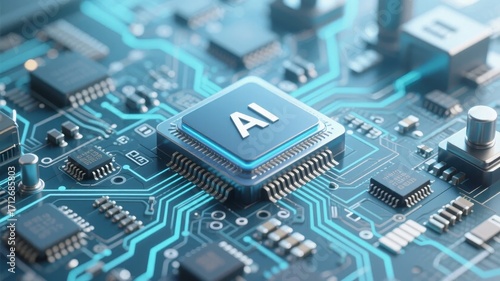 Close-up of an AI processor chip on a circuit board with illuminated blue pathways