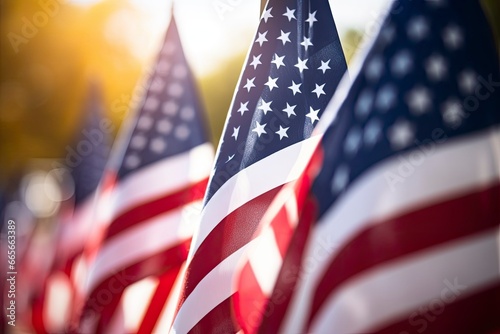 Closeup of an American flag in a row.