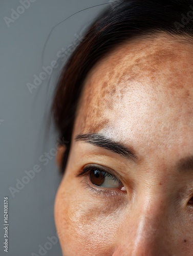 Close-up of an Asian woman’s forehead with visible melasma patches. Clean framing with studio lighting