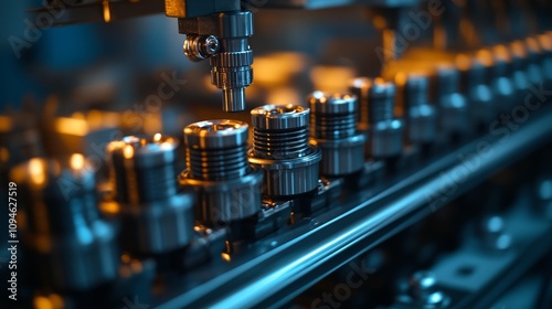 drill, drilling, gear, metal, machine, automated, industrial, process, manufacturing, production, factory, workshop, technology, engineering, automation, machinery, precision, assembly, line, conveyer, belt, tool, equipment, part, component, steel, chrome, shiny, metallic, detail, sharpened, blurred, background, depth, field, light, shadow, contrast, blue, grey, orange, dark, bright, sharp, intricate, design, complex