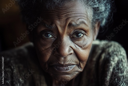 Close-up of an elderly woman, her face etched with the lines of wisdom and experience. Her eyes are calm yet full of stories, portraying a rich, complex life.