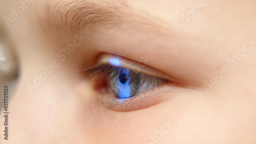 Close-up of an eye. Close-up of an ophthalmological examination in a modern ophthalmology clinic. Vision correction and examination. Diagnosis of vision at an early age.