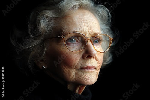 Close-up of an old woman looking to the side, studio shot.