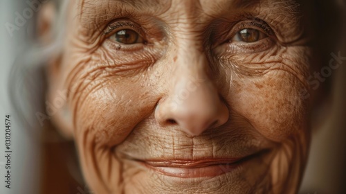 Close-up of an older woman with a serene smile, reveling in the softness of her skin, symbolizing the beauty and grace of aging gracefully