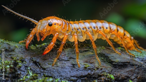 insect, invertebrate, arthropod, centipede, millipede, creature, animal, wildlife, nature, wild, forest, jungle, macro, photo, closeup, detail, segmented, leg, antennae, orange, brown, black, green, moss, wood, log, dark, background, tropical, exotic, small, tiny, body, head, eye, fauna, biodiversity, life, vibrant, colours, texture, surface, environment, habitat, specimen, biology, zoology, entomology, science