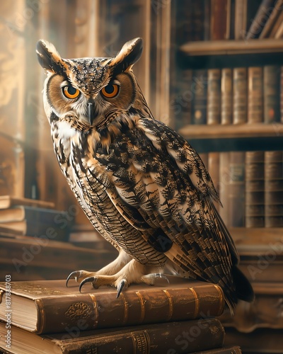 Closeup of an owl on a book, symbolizing wisdom, in a realistic style, with a softly lit library as the background