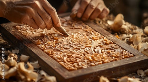 wood, carving, artisan, hand, craft, skill, art, detail, floral, design, pattern, texture, wood carving, craftsmanship, traditional, intricate, sculpture, relief, ornament, hand-made, antique, vintage, artistry, natural, wooden, panel, frame, tool, chisel, creation, artist, work, project, process, workshop, studio, sunlight, light, shadow, brown, gold, beauty, culture, heritage, decor, home, furniture, table, object