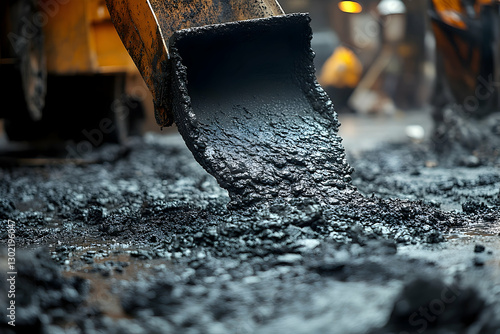 Close-up of asphalt being poured during road construction, conveying infrastructure work