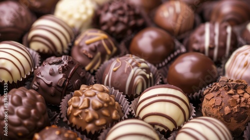 Close-up of assorted chocolate truffles with decorative patterns. World Chocolate Day