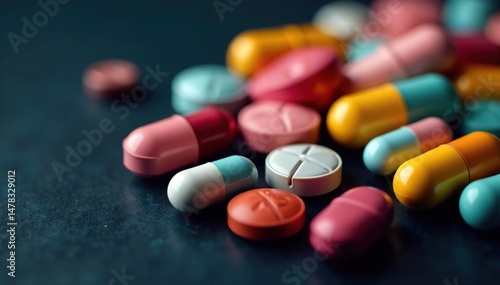 Close-up of assorted colorful pills and capsules against a dark background , vibrant, pills, studio shot
