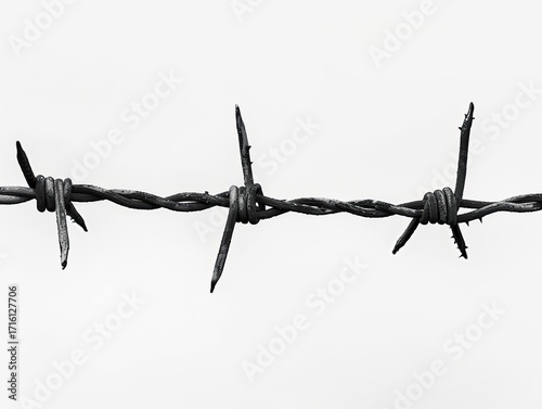 Close-up of barbed wire against a stark white background, showcasing its texture and sharp points. The wire is dark gray and appears weathered