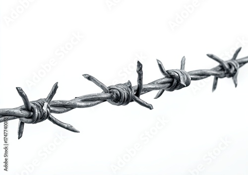 barbed, wire, metal, fence, security, protection, sharp, dangerous, twisted, defense, industrial, isolated, grey, silver, horizontal, close, up, detail, knot, point, spike, barb, twine, tension, strength, tough, hard-wearing, containment, restriction, barrier, threat, danger, hazard, imprisonment, military, frontier, border, delineation, limitation, separation, obstacle, hindrance, constriction, guarded, restricted, impenetrable, force