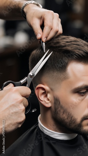 Close-up of barber cutting hair with scissors