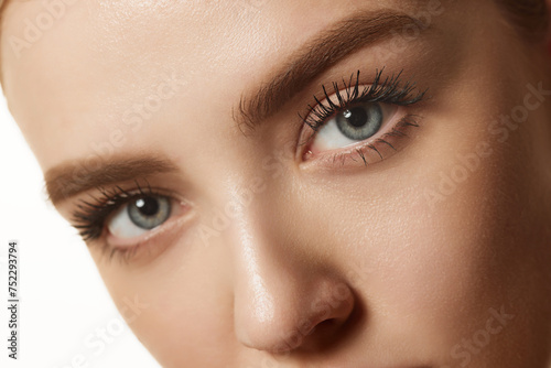 Close-up of beautiful female face isolated against white studio background. Model with well-kept, spotless, smooth skin. Concept of natural beauty, cosmetology, cosmetics, skin care and health