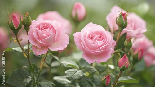 Close-up of beautiful pink roses in full bloom with delicate petals and vibrant green leaves, creating a romantic and elegant floral background for nature-themed designs and garden aesthetic inspirati
