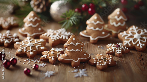 Close-up of beautifully decorated gingerbread cookies in festive shapes like trees and snowflakes, surrounded by holiday decor. Perfect for Christmas celebrations