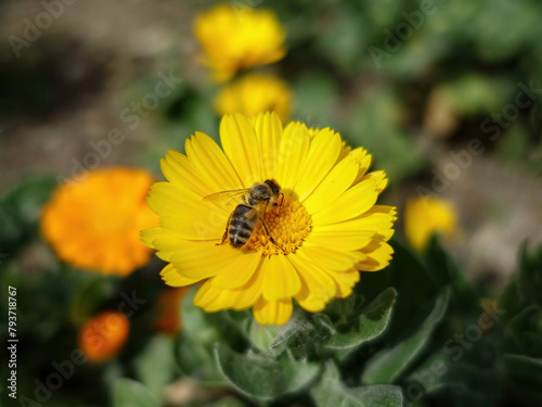 Close-up of bee on yellow flower, bee is pollinating the flower