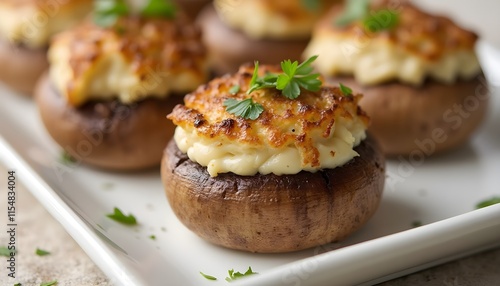 Close-Up of Beef and Blue Cheese Stuffed Mushrooms on White Plate