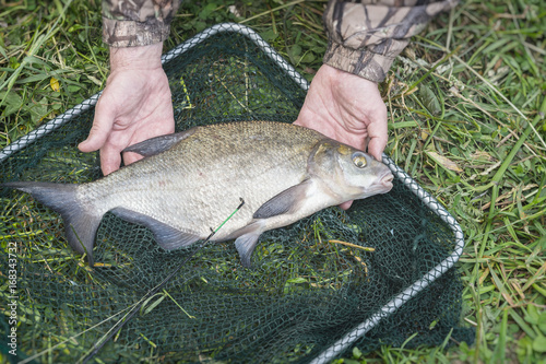 Close-up of big caught fish, bream on fishing line in palms fisherman over landing net. Concepts of successful fishing, fortune, success, active rest, hobbies
