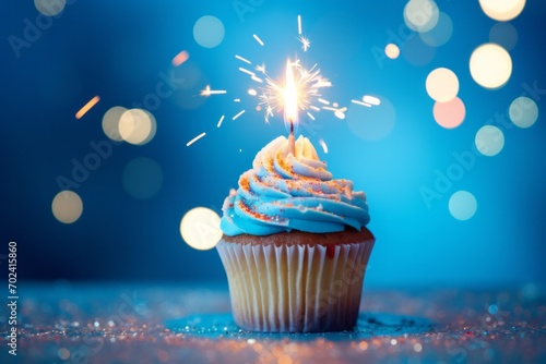 background, baked, birthday, blue, cake, candle, celebration, cupcake, dessert, food, frosted, frosting, 1, party, sprinkle, sweet, colourful, copy space, cream, cup, decorated, iced, icing, lit, nobody, snack, unhealthy, horizontal, american, baking, chocolate, colours, day, delicious, fireworks, 4th july, happy, holiday, homemade, independence, patriotic, sparkler, star, swirl, blue background, birthday party, birthday cake