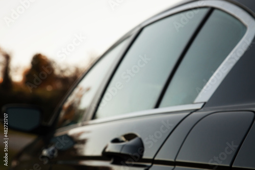 car, closeup, outdoors, horizontal, day, part of, transportation, black, land vehicle, glasses, single object, no people