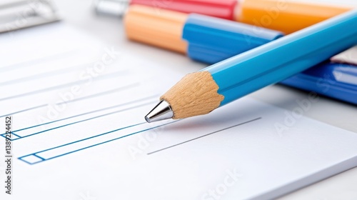 Close-Up of Blue Pencil on Blank Paper with Colorful Pens Nearby