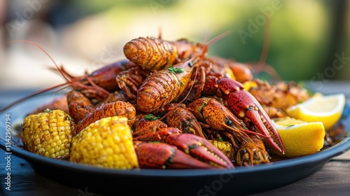 Close-up of boiled crawfish with corn and lemon on a dark plate. Showcase Southern food and Louisiana cuisine with this vibrant image.