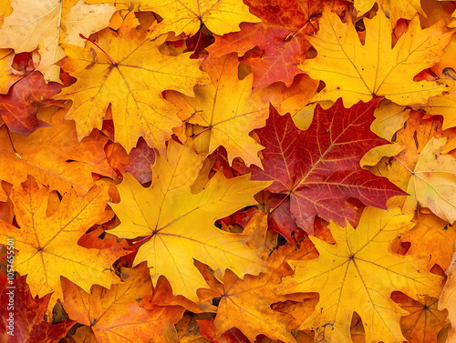 Closeup of Bright, colorful and beautiful Fall autumn leaves for background wallpaper or business banner lit by bright sunny daylight