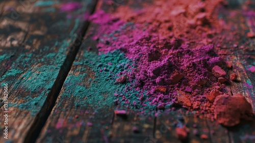 Close-up of bright Holi powders spread on a rustic wooden surface, vibrant and colorful, perfect for Holi, cultural festivals, celebrations, and artistic food or color photography.