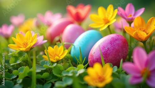 Close-up of brightly colored Easter eggs nestled in a bed of spring flowers, symbolizing rebirth and new life , lilies, christian, basket