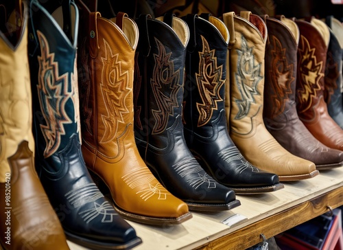 Close-up of brown cowboy boots on sale in downtown Nashville, Tennessee shop. Male footwear accessory with unique colors, style. Nashville tourist attraction, travel, leisure, downtown shopping