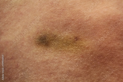 Close-up of bruise injury on skin. Wounded skin with hematoma. Bruised leg after home abuse. Bruise occuring as result age due to thinning of the skin. Inflammation knee from trauma. Medical problem