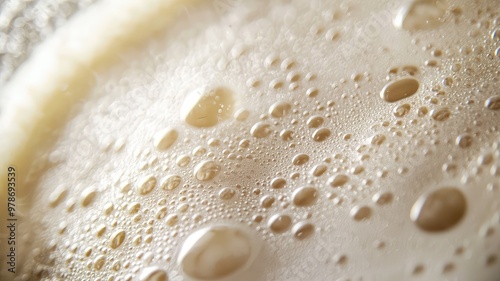 Close-up of bubbly beer foam, showcasing textures and intricate details. Perfect for beverage-themed projects or food photography.