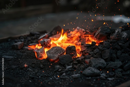 Closeup of burning embers on a black surface, closeup, small flame, heat, burning embers