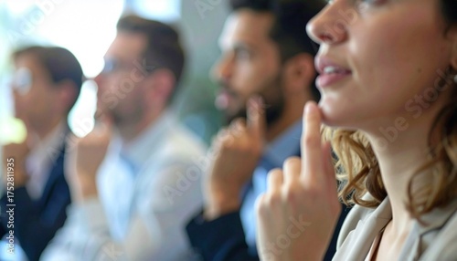Close-up of business people in presentation asking questions for answer, meeting or ideas.