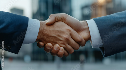Close-up of businessman handshake symbolizing a successful business agreement with blurred city building background