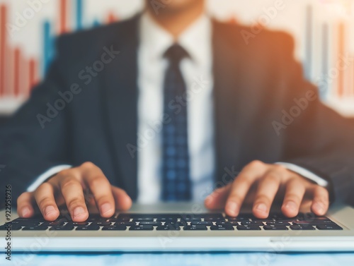 Close-up of businessman's hands typing on laptop keyboard.